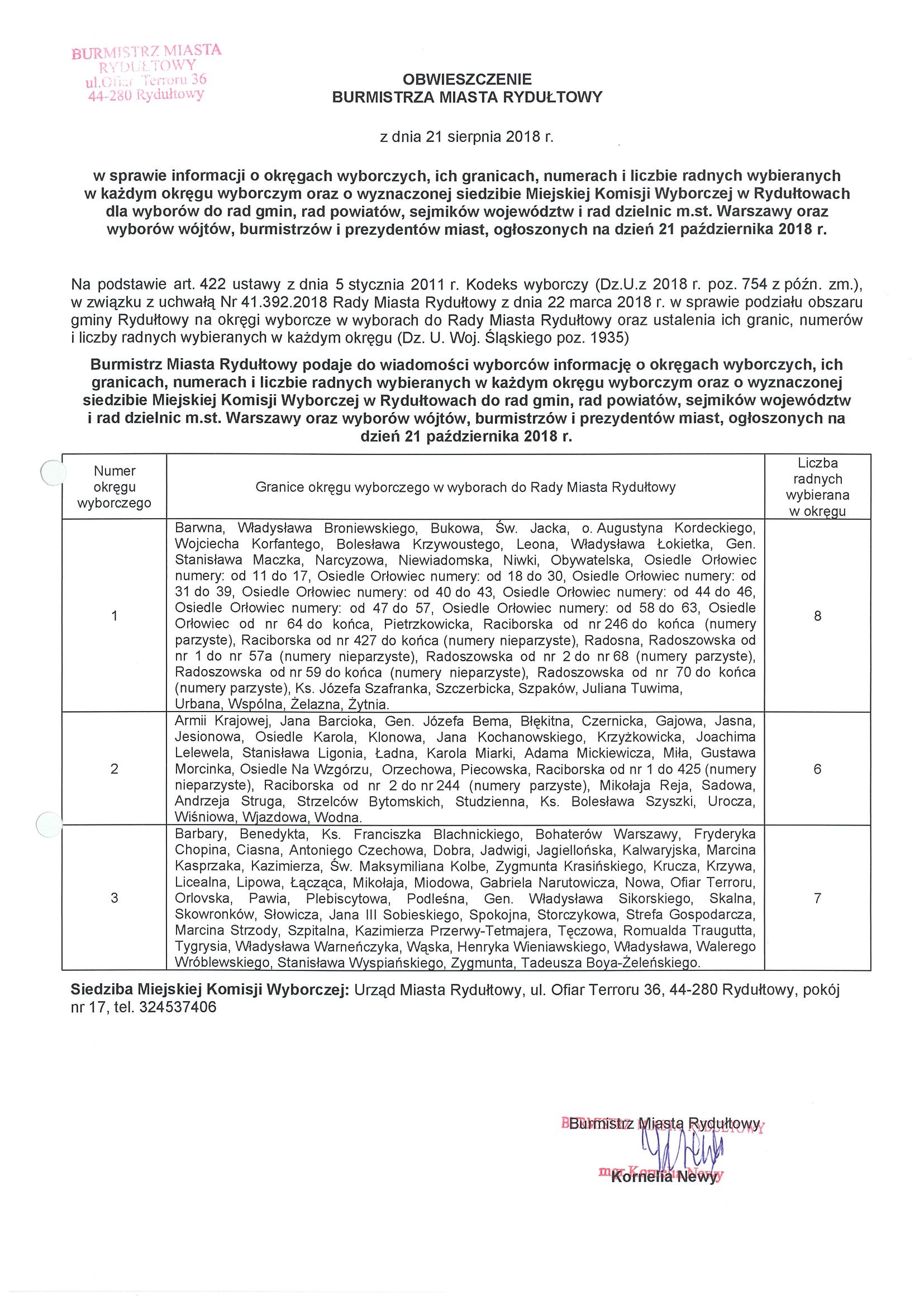 OBWIESZCZENIE Burmistrza Miasta Rydułtowy z dnia 4 września 2018 r. w sprawie informacji o numerach i granicach obwodów głosowania oraz siedzibach obwodowych komisji wyborczych, w tym o lokalach przystosowanych do potrzeb osób niepełnosprawnych oraz o możliwości głosowania korespondencyjnego przez wyborców niepełnosprawnych i możliwości głosowania przez pełnomocnika, w wyborach do organów jednostek samorządu terytorialnego, ogłoszonych na dzień 21 października 2018 r. oraz OBWIESZCZENIE BURMISTRZA MIASTA RYDUŁTOWY z dnia 21 sierpnia 2018 r. w sprawie informacji o okręgach wyborczych, ich granicach, numerach i liczbie radnych wybieranych w każdym okręgu wyborczym oraz o wyznaczonej siedzibie Miejskiej Komisji Wyborczej w Rydułtowach dla wyborów do rad gmin, rad powiatów, sejmików województw i rad dzielnic m.st. Warszawy oraz wyborów wójtów, burmistrzów i prezydentów miast, ogłoszonych na dzień 21 października 2018 r.